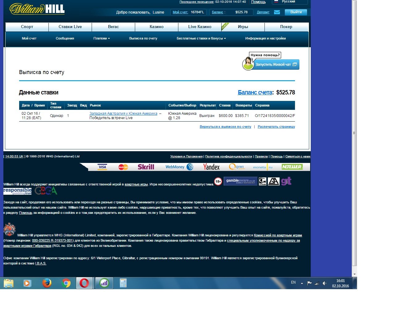 Неправильно рассчитанная ставка в БК William Hill — 6 Октября 2016