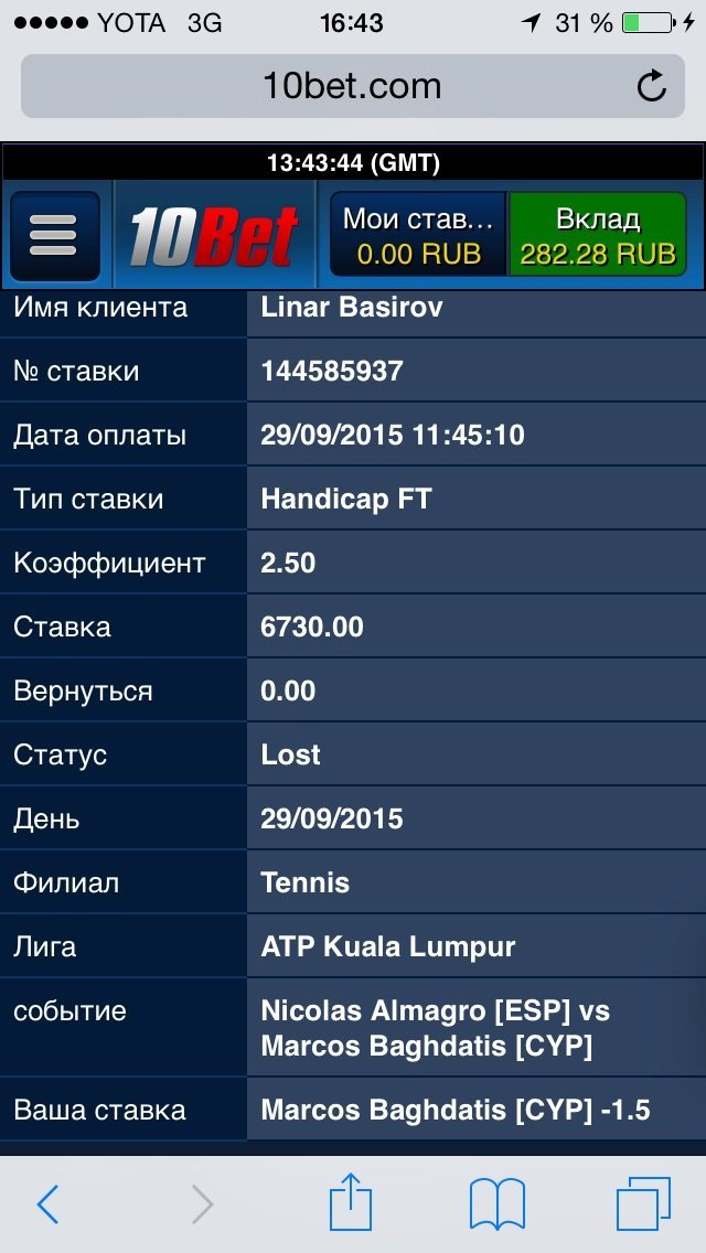 Неправильно рассчитанная ставка в букмекерской конторе 10bet.com — 30 Сентября 2015