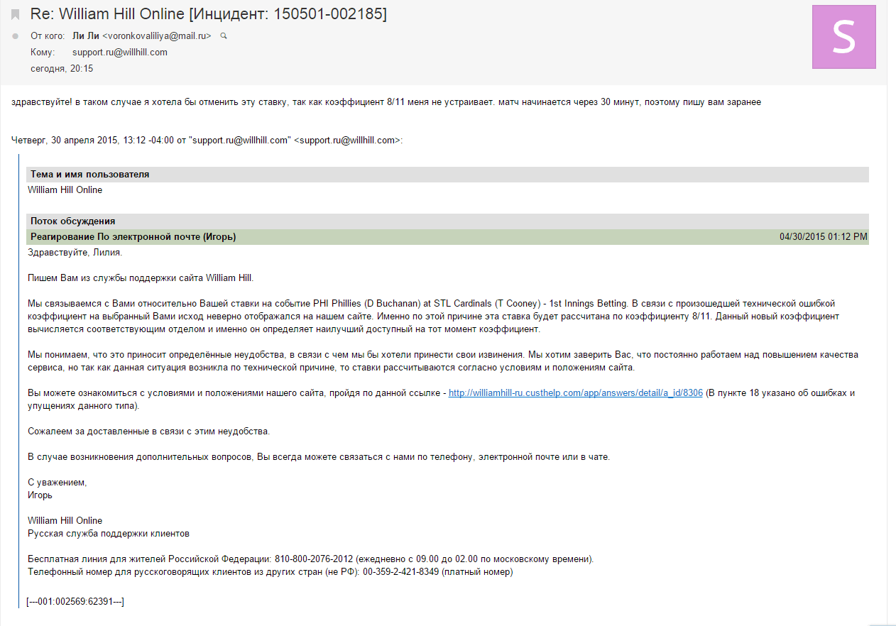 Прошу вас помочь разобраться в ситуации и обязать William Hill вернуть мне мои денежные средства по ставке номер O/12508748/0000490/F