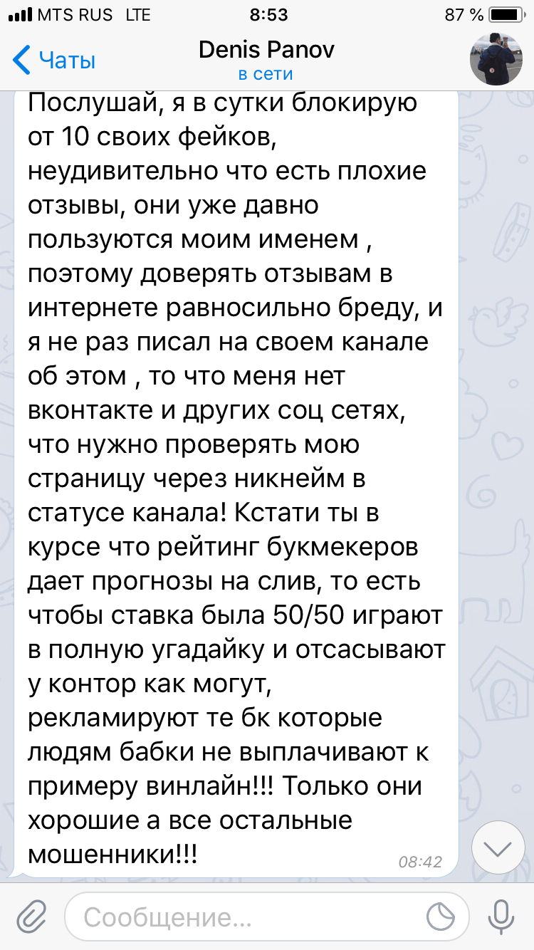 Мошенническая капперская группа в «ВК» «Бесплатные прогнозы на спорт» и ее руководитель Денис Панов (vk.com/id460762058), он же Дарья Логинова, занесены в черный список нашего рейтинга. Каппер не выполняет обязательства по возврату средств, гарантирует прибыль и присваивает денежные средства. Ознакомиться с критериями оценки капперов можно здесь.