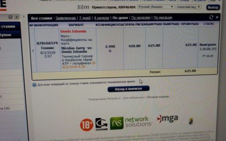 Победа Истомин коэффициент 2,5Первый раз купил прогноз и сразу же такой выигрыш надеюсь продолжим в том же духе.